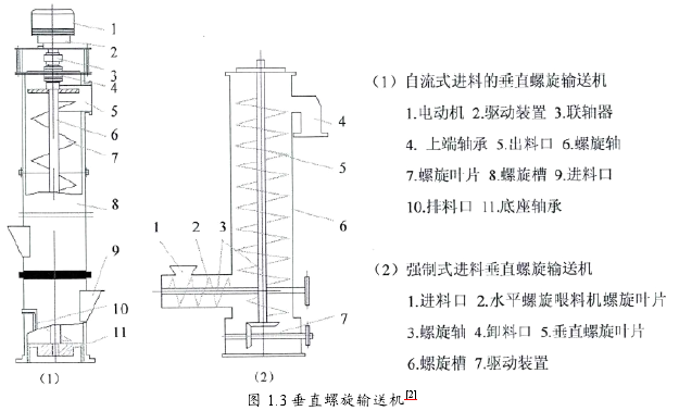 宏源機(jī)械公司生產(chǎn)的垂直螺旋輸送機(jī)由垂直螺旋主體、下端進(jìn)料口、料槽、軸承、上端出料口、以及驅(qū)動(dòng)裝置六部分共同組成的垂直螺旋輸送機(jī)如圖1.3所示。垂直螺旋輸送機(jī)的驅(qū)動(dòng)形式可根據(jù)實(shí)際情況選用頂部驅(qū)動(dòng)、底部驅(qū)動(dòng)或雙向驅(qū)動(dòng)。垂直螺旋輸送機(jī)的正常工作必須保證其對(duì)物料顆粒的做功大于物料自重和物料在機(jī)殼內(nèi)的摩擦阻力所作的功。